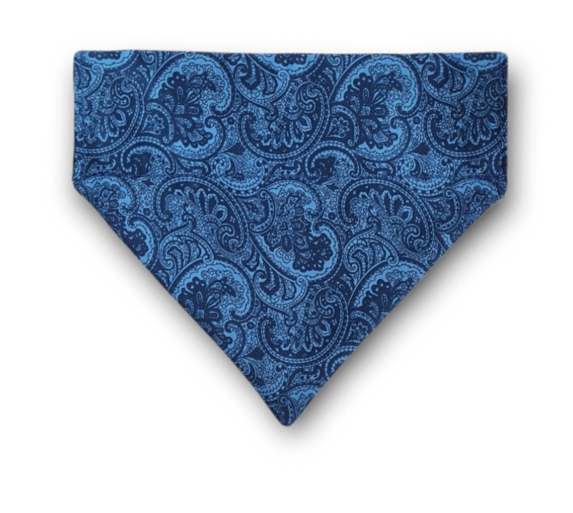 Blue paisley dog bandana, slip on collar style.