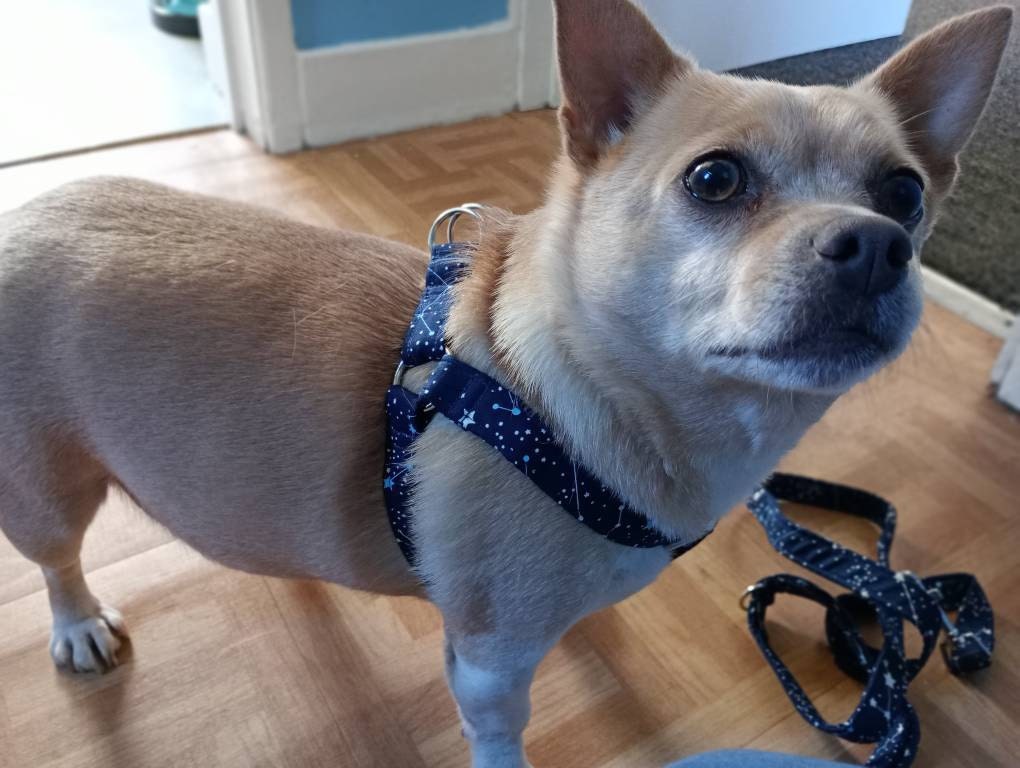Our harnesses are made with a durable polypropylene webbing covered in this constellation print cotton design and the assembled with our strong metal hardware to give your harness a luxurious finish.