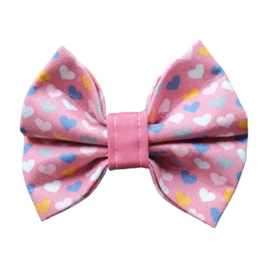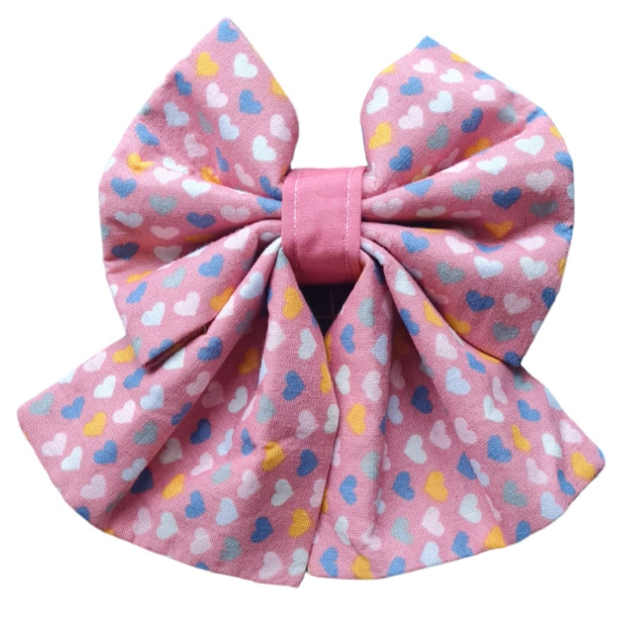 Get your dog ready for the day of love with our valentines love heart bow ties and sailor bows. This bow comes in a lovely dusky pink with small bows scattered over it. its a lovely touch to add to your dogs collar for the special day.