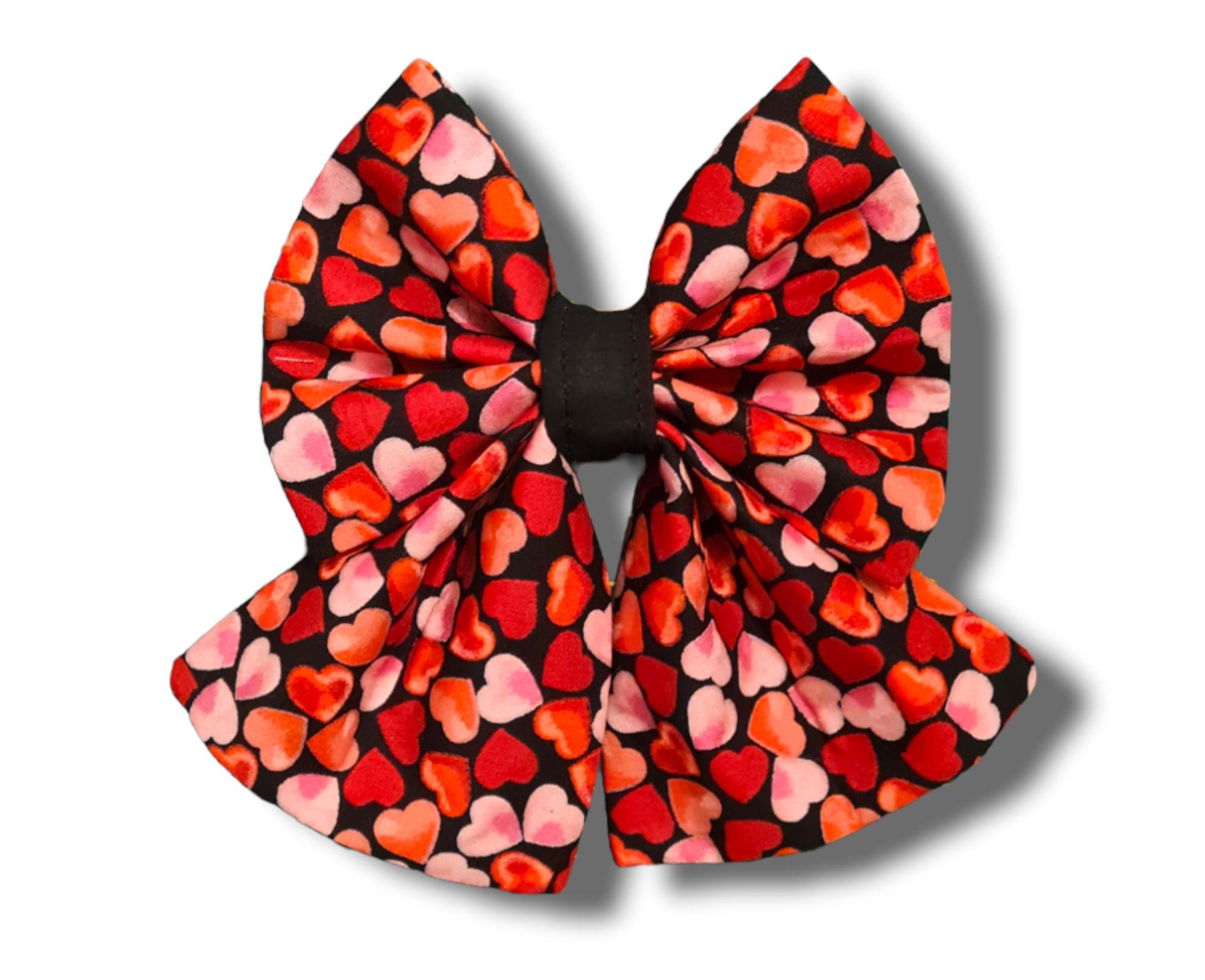 Get your dog ready for the day of love with our valentines love heart bow ties and sailor bows. This bow comes in a lovely scarlet red and black with small bows scattered over it. It adds a lovely touch to your dogs collar for the special day.
