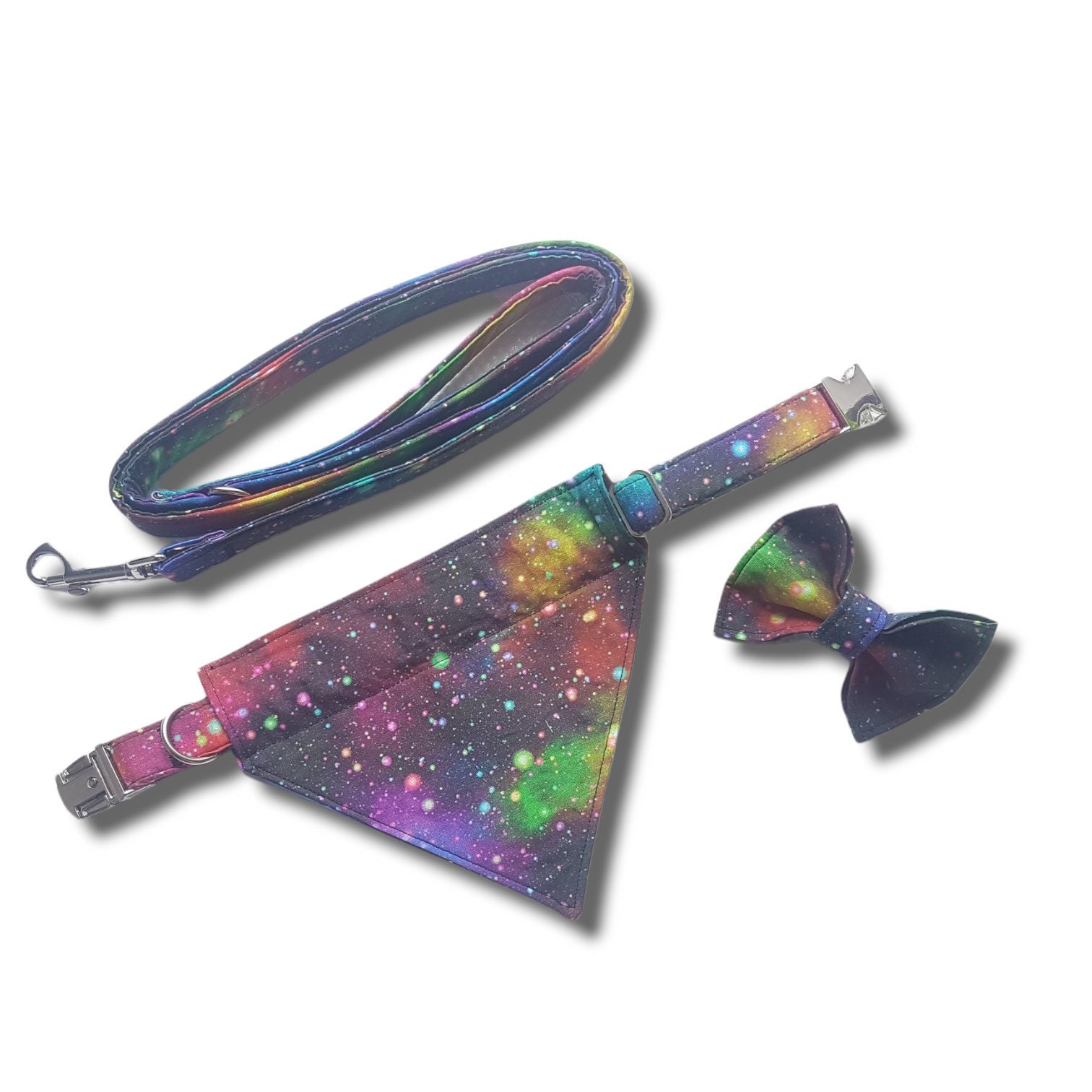 This ‘out of this world’ galaxy themed bow tie is super easy to put on your dog – with elastic attached to the back of the bow it can stretch to fit various sizes of collars.
