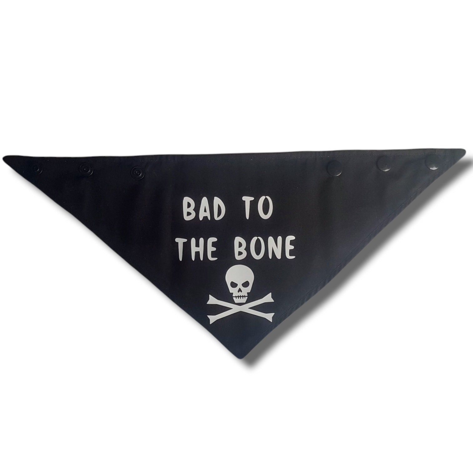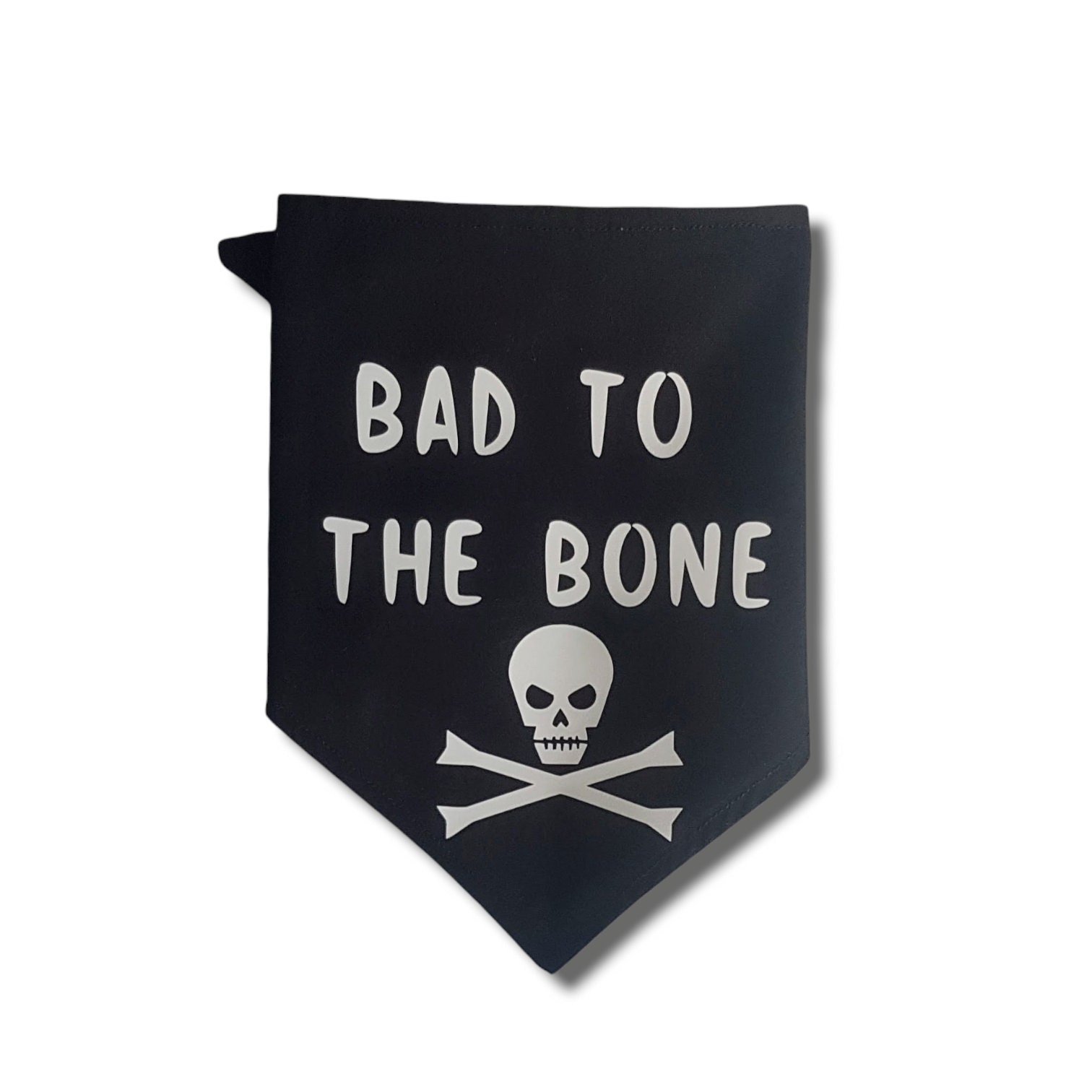 With the spooky skeleton design on one side this bandana can be reversed to reveal a black back round with the phrase 'BAD TO THE BONE' applied on the opposite side with the best heat transfer vinyl available.